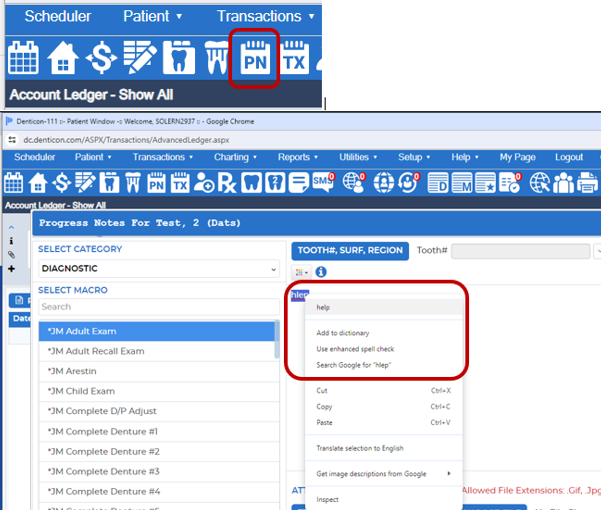 Spell check is available under the PN Icon (progress notes screen) in Denticon.