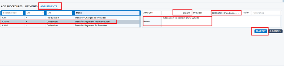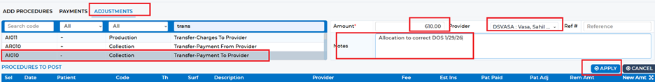 Next, again under the “Adjustments” tab, select “Transfer – Payment To Provider.” Enter the same amount and assign it to the correct provider. Include a note and click Apply to complete the transfer.