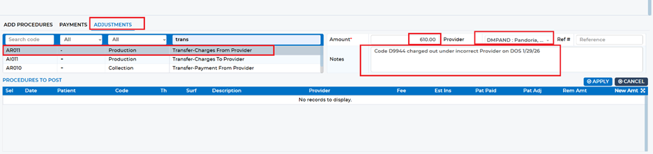 Next, within the patient chart for the account being corrected, navigate to the “Payments/Adjustment” screen. Select the “Adjustments” tab and locate the adjustment labeled “Transfer – Charges From Provider.” This adjustment removes the production amount from the incorrect provider. Ensure you select the provider the services were originally posted under and enter the exact amount shown in the ledger. Always include a note explaining the reason for the adjustment. Once complete, click Apply to post the adjustment.