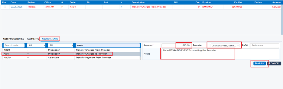 Then, remain on the same screen and again select the “Adjustments” tab. This time, choose “Transfer – Charges To Provider.” This adjustment moves the production to the correct provider. Enter the same amount used in the previous step and select the appropriate provider. As before, include a clear note and click Apply to finalize.