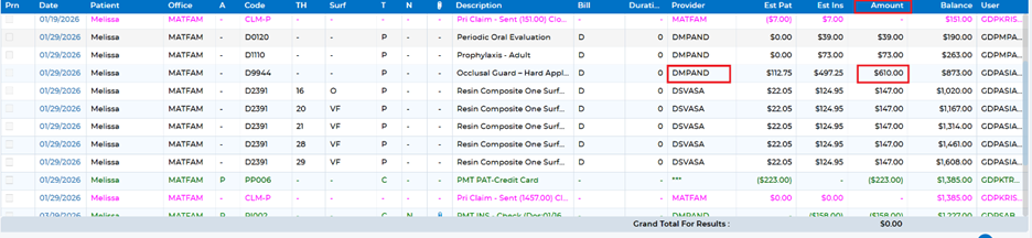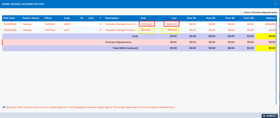 You will typically see a credit (highlighted in Red) under the original provider and a corresponding balance(highlighted in Yellow) under the correct provider. This indicates that the payment must be transferred.