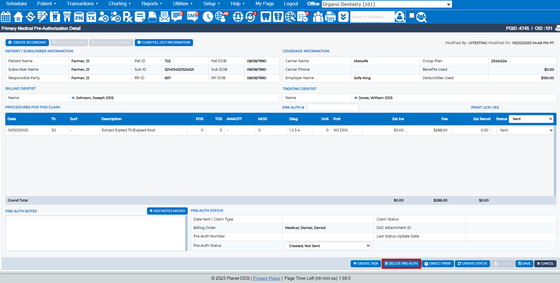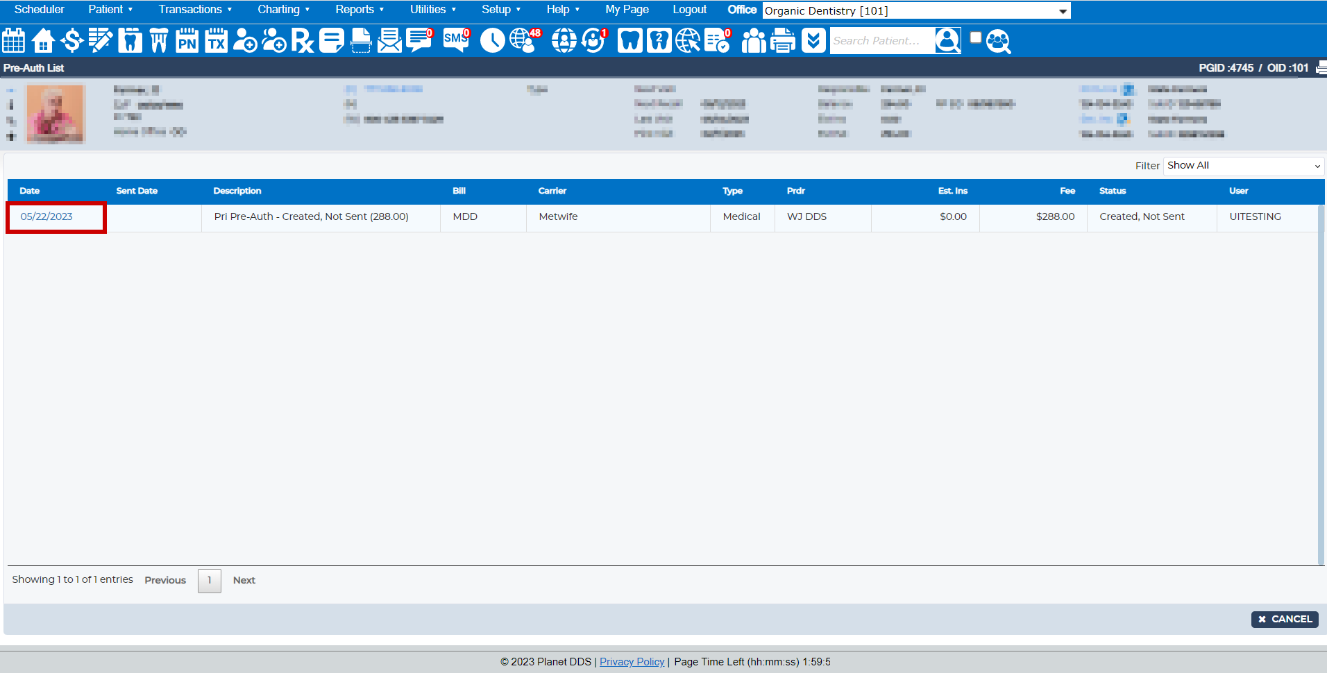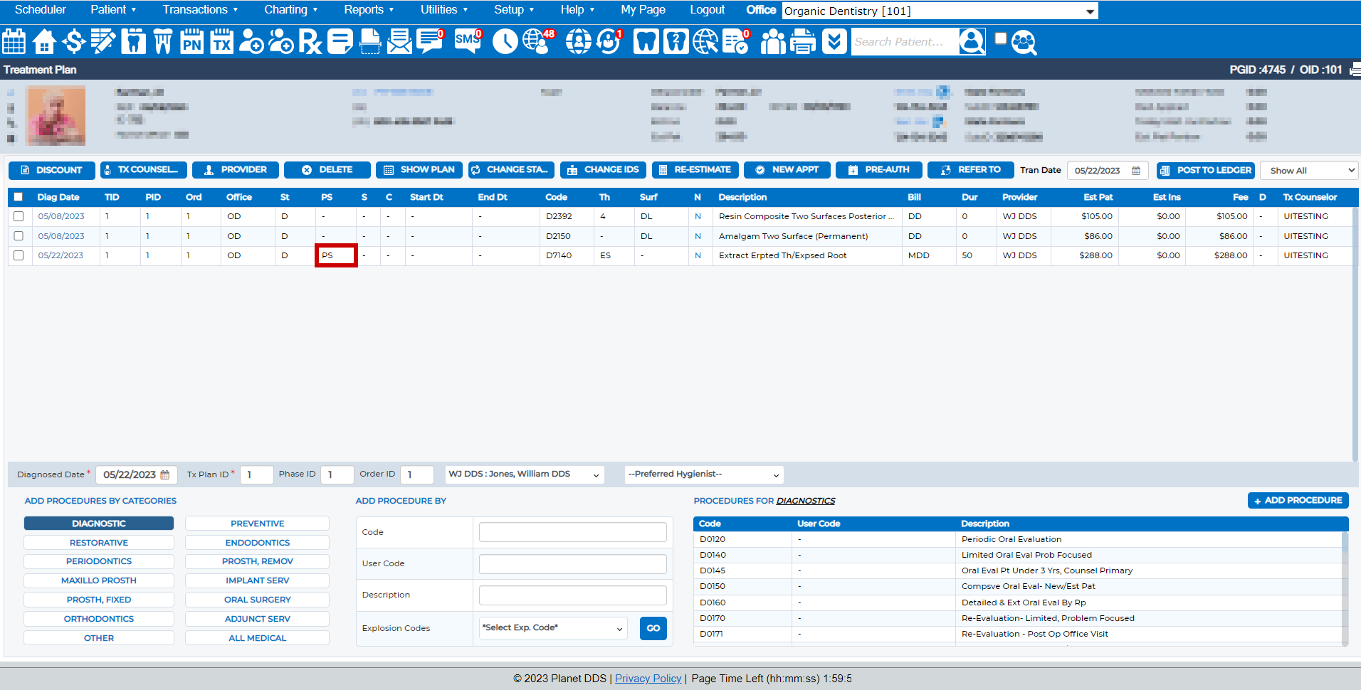 When a pre-authorization is generated and submitted to the insurance carrier, the Treatment Plan screen indicates “PS” (pre-authorization sent).