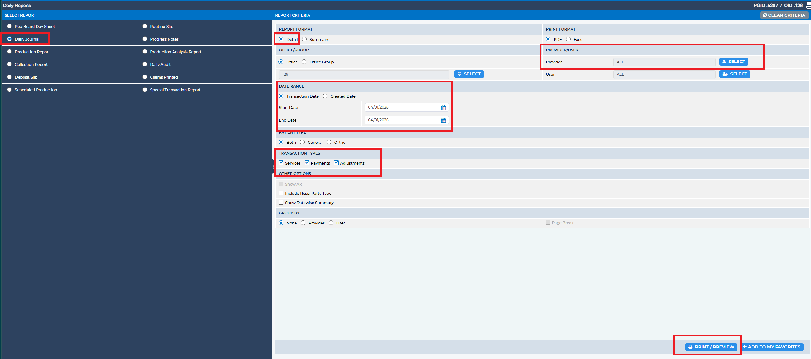The Daily Journal by Provider (Detailed) report is used to review provider activity for a selected date. It identifies providers with charges on that day, verifies the services performed by each provider, and displays all transactions posted to the ledger.